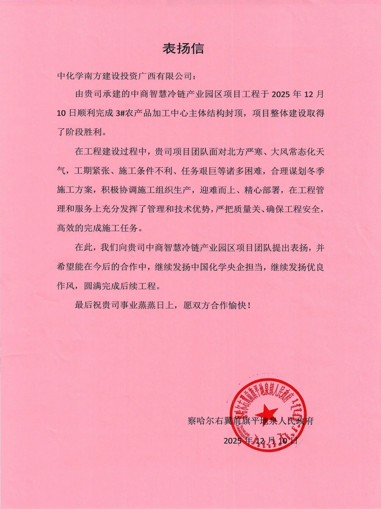 大干四季度 決勝收官戰|中商蒙北優鮮智慧冷鏈產業園區項目收獲2封表揚信